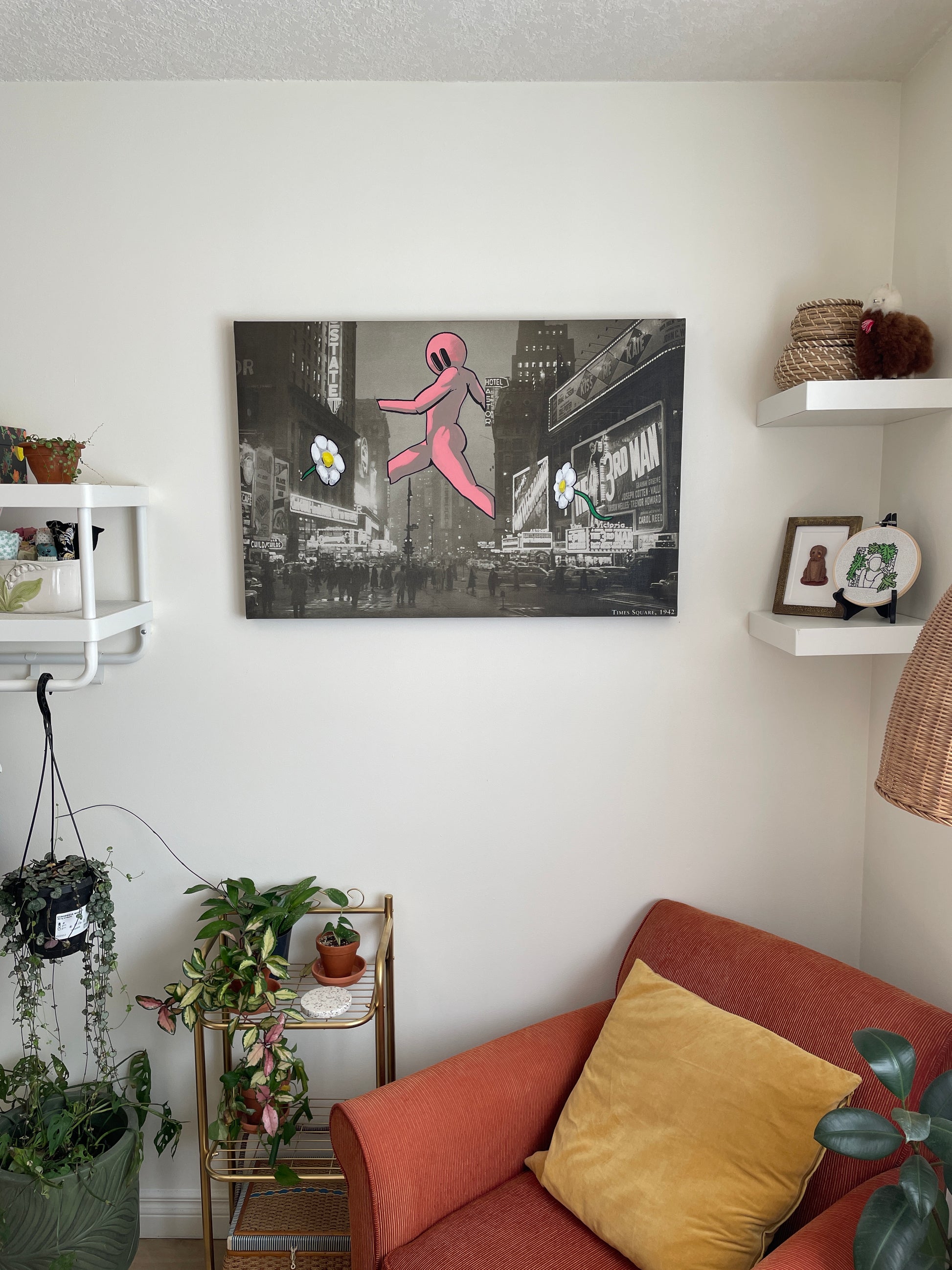 Painting of a pink figure walking through the background of a scene in Time Square, New York City. Painted over a canvas print I found at a thrift store.