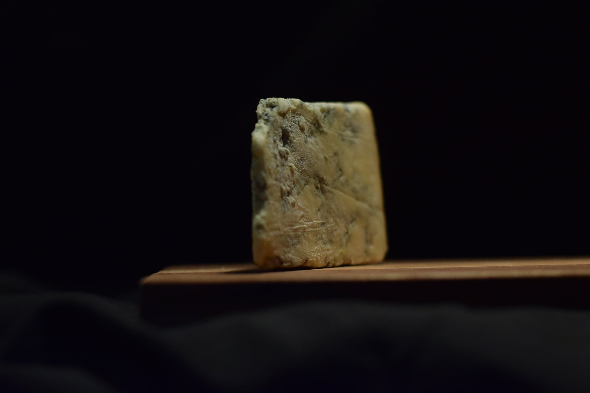 A collection of 13 photos of some blue cheese I bought at the store and photographed on a wooden cutting board with a dark background. No copyright, free to use for any purpose.