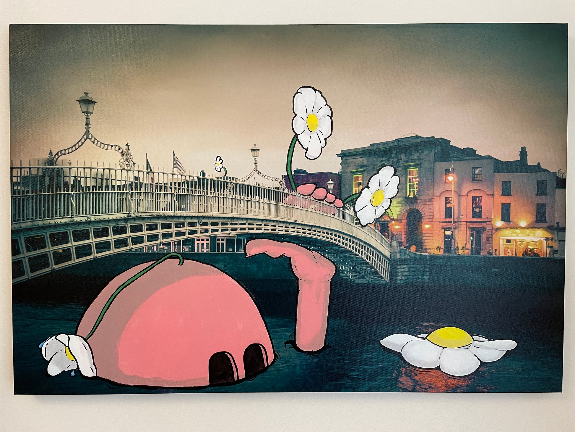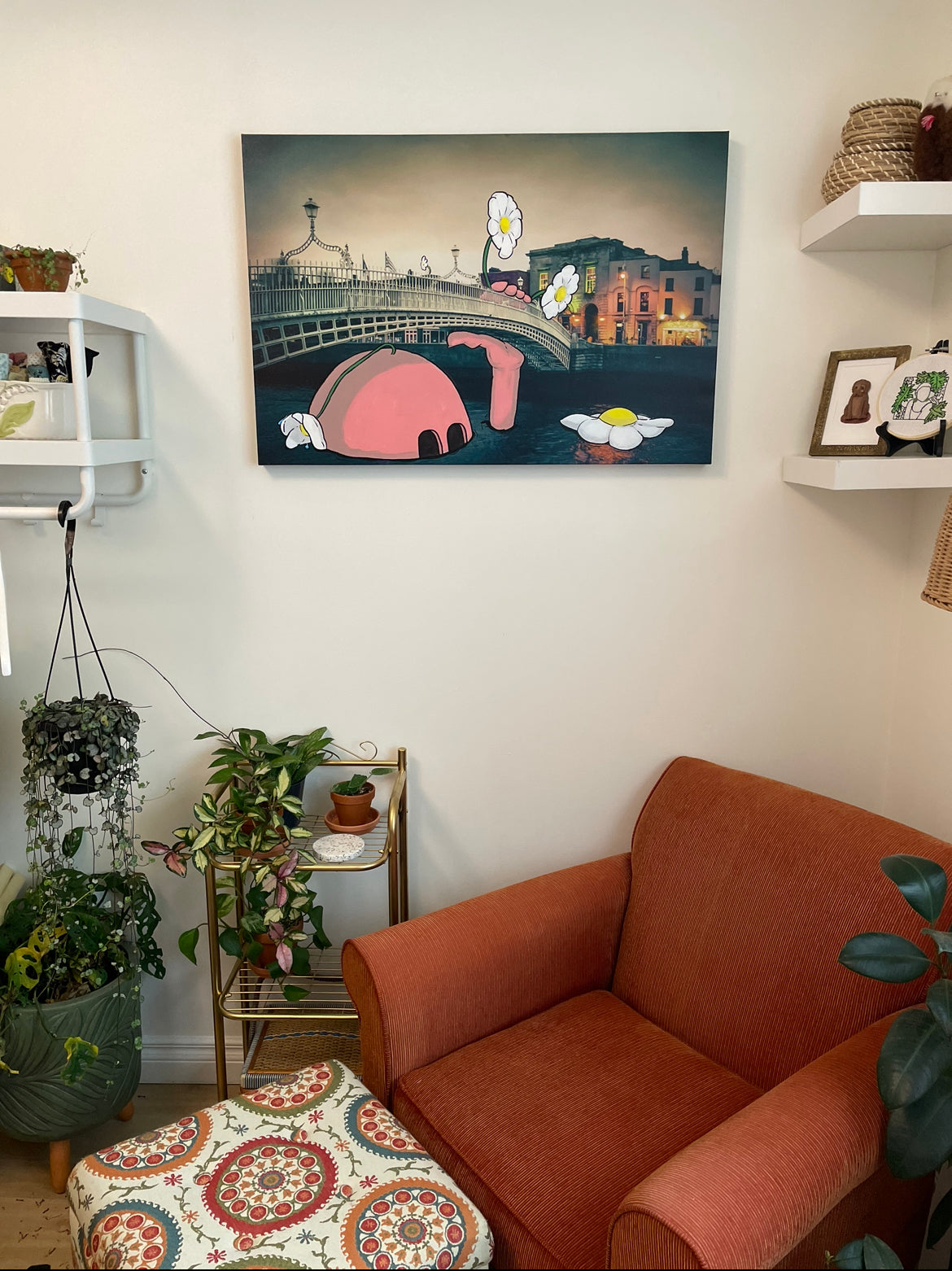 Figure emerging from the water under Haypenny Bridge in Dublin Ireland. Painted over a canvas print I found at a thrift store.